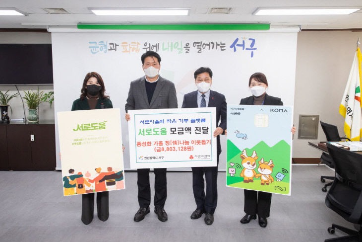 구는 지난 4일 인천사회복지공동모금회(회장 조상범)와 서로도움 모금액 전달식을 열었다. 이날 전달식에서 강범석 서구청장은 "서로도움으로 모아진 구민의 소중한 정성이 어려운 이웃에게 큰 힘이 될 것"이라며 "앞으로도 구가 추진하는 사업에 많은 관심을 부탁드린다"고 말했다.