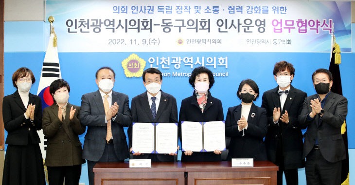 인천시의회와 동구의회는 9일 시의회 의장접견실에서 허식 인천시의회 의장과 유옥분 동구의회 의장, 각 의회 관계자 등이 참석한 가운데 인사 운영 업무 협약을 체결했다.