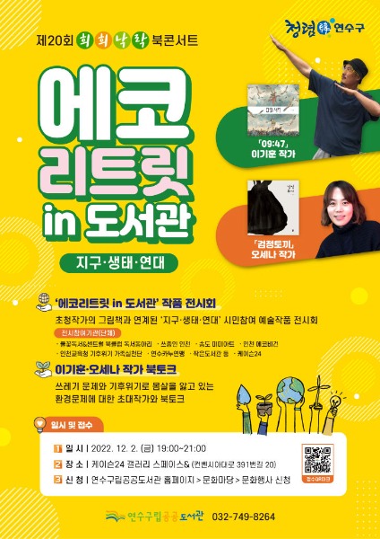 인천시 연수구 구립공공도서관은 내달 2일 송도케이슨24 카페 갤러리에서 '지구·생태·연대'를 주제로 제20회 희희낙락 북콘서트 '에코리트릿 in 도서관'을 개최한다.