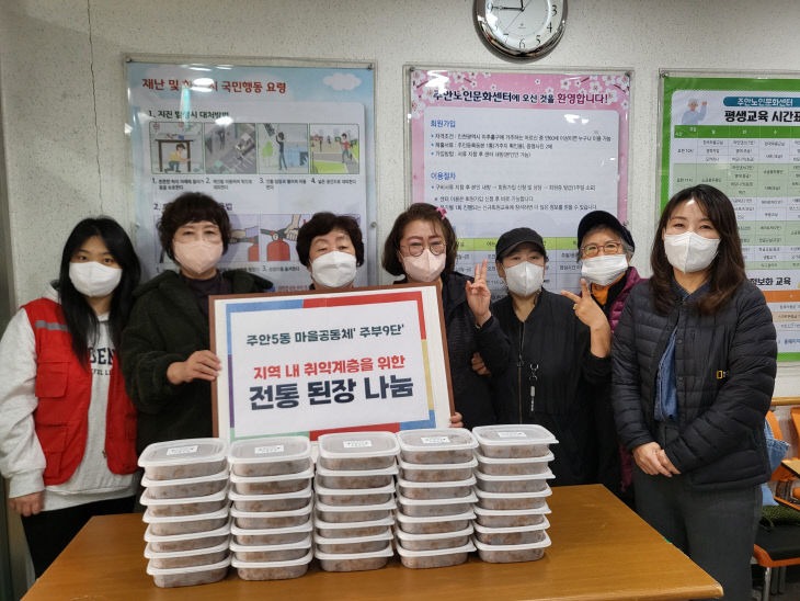 인천시 미추홀구 주안5동 마을공동체 '주부9단'이 18일 주안노인문화센터에서 급식 서비스를 지원받고 있는 홀몸노인 등 취약계층 40가구에 직접 담근 된장을 전달했다.