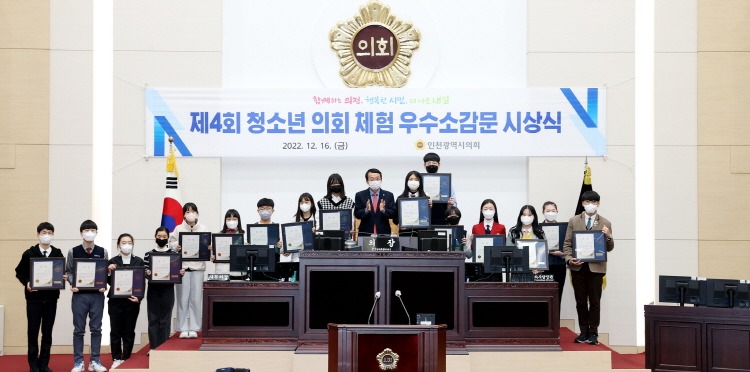 인천광역시의회(의장 허식)는 최근 본회의장에서 ‘2022년 청소년 의회체험 우수소감문’ 최우수자로 선정된 15명의 청소년이 참석한 가운데 시상식을 개최했다고 18일 밝혔다.