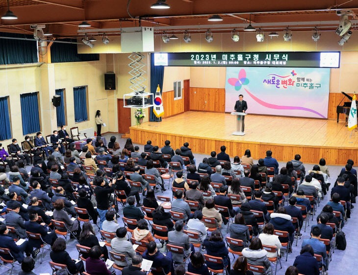 인천시 미추홀구는 2일 구청 대회의실에서 필수 민원 담당공무원을 제외한 전 직원이 참석한 가운데 시무식을 갖고 2023년 계묘년(癸卯年) 힘찬 출발을 알렸다.