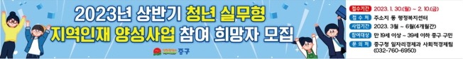 인천 중구(구청장 김정헌)는 1월30~2월10일까지 ‘2023년 상반기 청년 실무형 지역인재 양성사업’ 참여자를 모집한다고 26일 밝혔다.