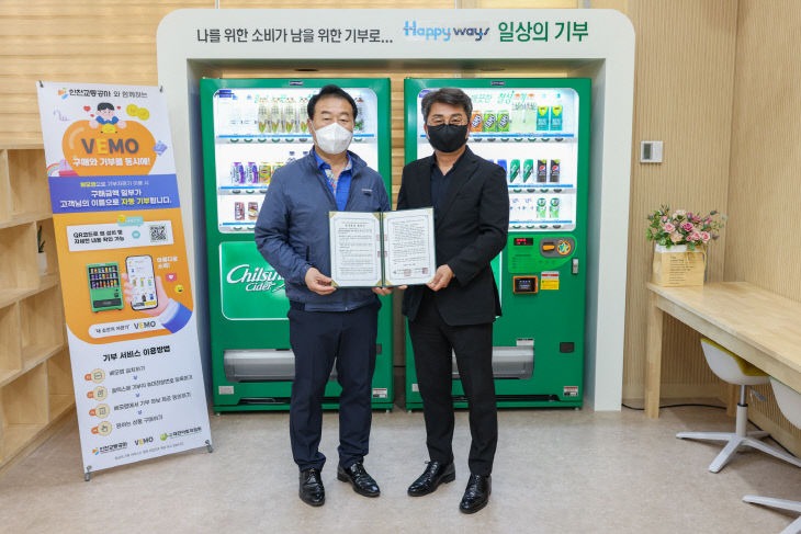 인천교통공사(사장 정희윤)는 지난 13일 본사 1층 사내복지공간 이룸에서 사단법인 대한아토피협회(회장 장재훈)와 업무제휴를 통해 '스마트 기부형 음료 자판기'를 설치했다고 밝혔다.