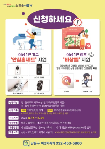 신청 대상은 남동구에 거주하는 여성 1인 가구 중 전세 환산가액 2억5천만 원 이하 전·월세 주택 거주자와 3억5천만 원 이하 여성 1인 점포 운영자이다.