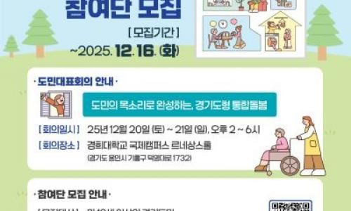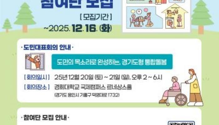 경기도는 오는 20~21일 경희대학교 국제캠퍼스에서 ‘도민 목소리로 완성하는, 경기도형 통합돌봄’을 주제로 도민대표회의를 개최한다.도민대표회의란...