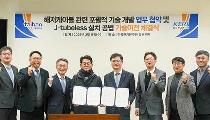 ▲ [왼쪽 세번째부터 대한전선 해저사업부문장 이춘원 전무, 생산∙기술부문장 김현주 전무, 한국전기연구원 김남균 원장, 주문노 전기기기연구본부장/...