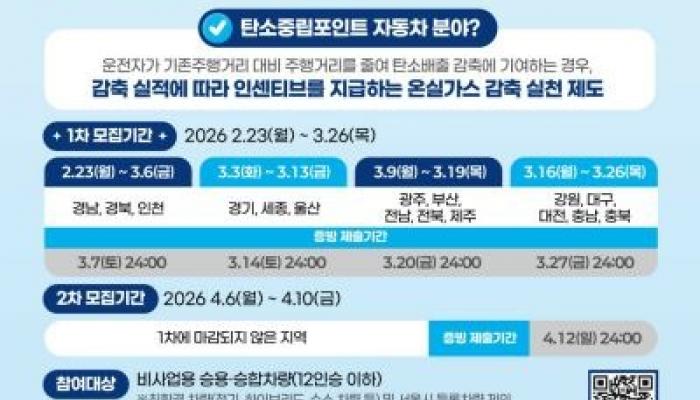 중구청이 자발적인 자동차 주행거리 감축 통해 전 지구적 기후 위기에 대응하고, 녹색생활을 실천할 수 있는 ‘2026년도 탄소중립포인트 제도 자동...