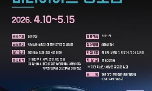 해운대구(구청장 김성수)는 창의적인 미디어아트 콘텐츠를 발굴하고 구민에게 새로운 문화예술 경험을 제공하기 위해 '해운대문화회관 미디어아트 공모전'을 개최한다.일반부, 청년부 2개 부문으로 나눠 모두 8편의 우수작을 뽑아 최우수(2) 각 200만 원, 우수(2) 각 100만 원, 장려(4) 각 50만 원의 상금을 수여한다.특히, 지역 예술인...