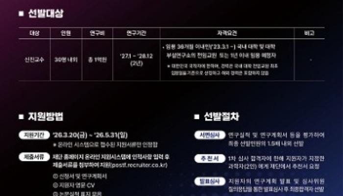 포스코청암재단이 국내 신진 과학자의 성장을 지원하는 ‘포스코사이언스펠로십’ 제18기 모집을 시작한다. 특히 올해는 환경 분야가 새롭게 신설되며,...