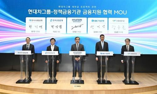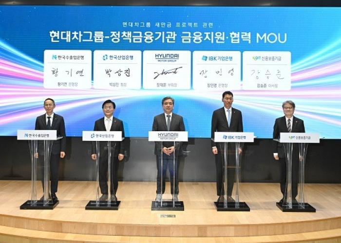 현대자동차그룹은 6일 서울 여의도 한국산업은행 본관에서 한국산업은행, 중소기업은행, 한국수출입은행, 신용보증기금 등 주요 정책금융기관과 ‘새만금 프로젝트 관련 현대차그룹-정책금융기관 금융지원·협력 업무협약’을 체결했다.▲ (왼쪽부터 ...