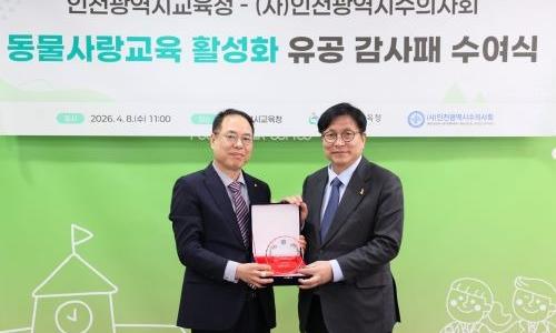 인천시교육청(교육감 도성훈)은 8일 인천광역시수의사회(회장 오보현)로부터 ‘학교로 찾아가는 동물사랑교육’ 활성화에 기여한 공로로 감사패를 전달받았다. ▲ (인천시교육청 제공)이날 수여식에는 도성훈 교육감을 비롯해 인천광역시수의사회 오보현 회장, 이정구 부회장, 신호숙 학술이사, 류민상 사업이사 등이 참석했다.이번 감사패 전달은 지난 202...
