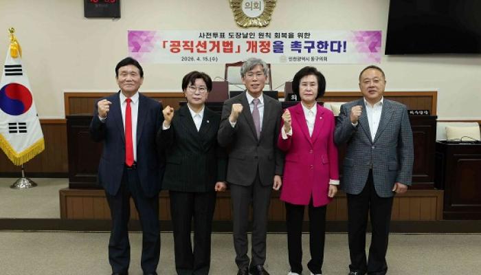 인천 동구의회(의장 유옥분)는 15일 열린 제291회 임시회 제1차 본회의에서 최훈 의원이 대표 발의한 『사전투표 도장날인 원칙 회복을 위한 공...