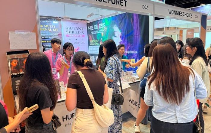 ▲ 한국공학대학교 GTEP사업단 학생들이 말레이시아 페낭에서 열린 ‘K-뷰티 엑스포 말레이시아’ 현장에서 현지 바이어 및 참관객들에게 시흥시 소재 기업인 휴포레의 제품을 소개하고 있다한국공학대학교(총장 황수성) 지역특화청년무역전문가양성사업단(이하 GTEP사업단