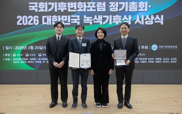 ▲ [사진=한국가스공사 제공]한국가스공사는 2월 25일 서울 영등포구 여의도 국회의원회관에서 열린 '2026 대한민국 녹색기후상 시상식'에서 감축·적응 부문 우수기관으로 선정돼 산업통상부장관상을 수상했다고 밝혔다.국회기후변화포럼이 주최하고 한국환경공단이 후원하는 '대한