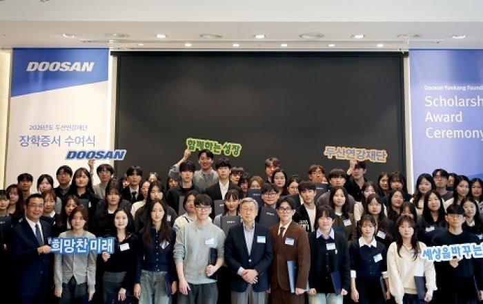 ▲[ ‘2026년 두산연강재단 장학증서 수여식’에서 두산연강재단 박용현 이사장(앞줄 가운데)이 장학생들과 기념사진 촬영을 하고 있다./두산연강재단 제공]두산연강재단이 올해 총 30억 원 규모로 장학금을 지원하겠다고 24일 밝혔다.두산연강재단은 23일 서울 서초구 양재