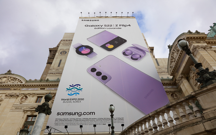 삼성전자가 28~29일 국제박람회기구(BIE) 171차 총회가 열리는 프랑스 파리에서 ‘2030 부산세계박람회(엑스포)’ 유치 활동을 홍보한다. 삼성전자는 파리 중심부에 위치한 오페라 극장 ‘오페라 가르니에’의 대형 옥외광고에 ‘2030 부산세계박람회’ 로고를 함께