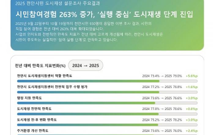 ▲ [천안시 도시재생시민 참여 경험이 263%로 급증했다./이미지=천안시 도시센터 제공]천안시 도시재생지원센터가 ‘2025 천안시 도시재생사업 성과관리 모니터링’의 일환으로 실시한 대시민 설문조사의 분석 결과를 발표했다. 이번 조사는 지난 2025년 9월 22일부터 1