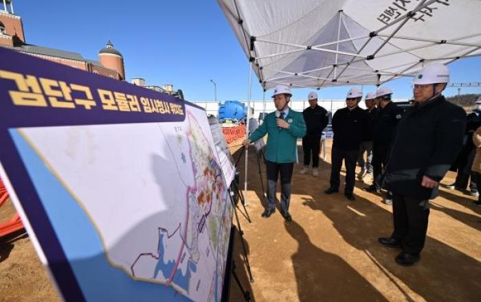 ▲ 유정복 시장이 21일 검단구 모듈러 임시청사부지에서 추진상황을 점검하고 있다.인천시가 2026년 7월 1일 새로운 검단구의 성공적이고 안정적 출범을 위해 검단구 임시청사에 내년 상반기 입주를 목표로 본격 추진하고 있다.유정복 시장은 11월 21일 검단구 임시청사 공