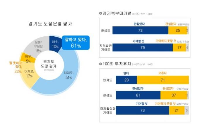 경기도민 10명 중 6명이 도정 운영을 긍정적으로 평가한 것으로 나타났다.경기도는 지난 9월 10일부터 14일까지 도민 2,000명을 대상으로 실시한 여론조사 결과 도정 긍정 평가는 61%, 부정 평가는 22%로 집계됐다고 1일 밝혔다. 이는 지난 6월 민선8기 3주년