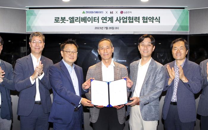 KT(www.kt.com)가 현대엘리베이터, 엘지전자와 함께 서울 종로구에 위치한 현대그룹빌딩 비전스튜디오에서 ‘로봇-승강기 연계 사업 협력 MOU’를 체결했다고 27일 밝혔다. 이번 협약식에는 이상호 KT AI 로봇사업단장, 도익한 현대엘리베이터 서비스사업부문장,