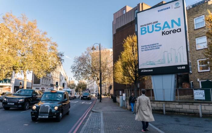 삼성전자가 영국 런던, 스페인 마드리드 등 유럽 주요 도시에서 대형 옥외광고를 통해 ‘2030 부산세계박람회(엑스포)’ 유치 열기를 알리고 있다. 삼성전자는 각국 대사관과 관광명소들이 위치한 나이츠브리지, 켄싱턴 등 런던 주요 도심에서 최근 새로운 부산엑스포 옥외