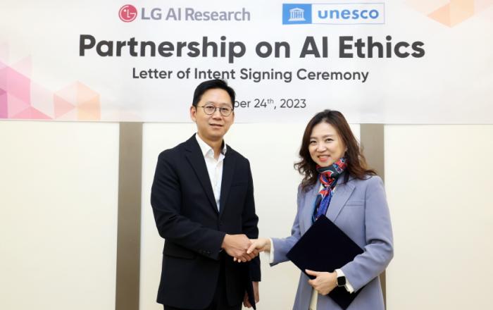 LG AI연구원은 지난 24일 오후 서울 강서구 마곡 LG사이언스파크에서 유네스코(UNESCO)와 AI 윤리 실행과 확산을 위한 협력 의향서(LOI)를 체결했다. 이날 LG AI연구원과 유네스코는 AI 윤리에 대한 이해와 인식을 높이기 위해 힘을 모으기로