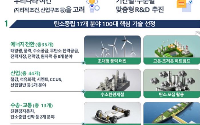 정부가 에너지 전환, 산업, 수송·교통, 건물·환경 부문과 관련된 17개 중점 분야를 대상으로 ‘한국형 탄소중립 100대 핵심기술’을 확정하고 본격적인 탄소중립 기술개발의 청사진을 제시했다. 또 석유화학, 철강, 시멘트 분야 ‘탄소중립 기술혁신 전략 로드맵’을 발표해