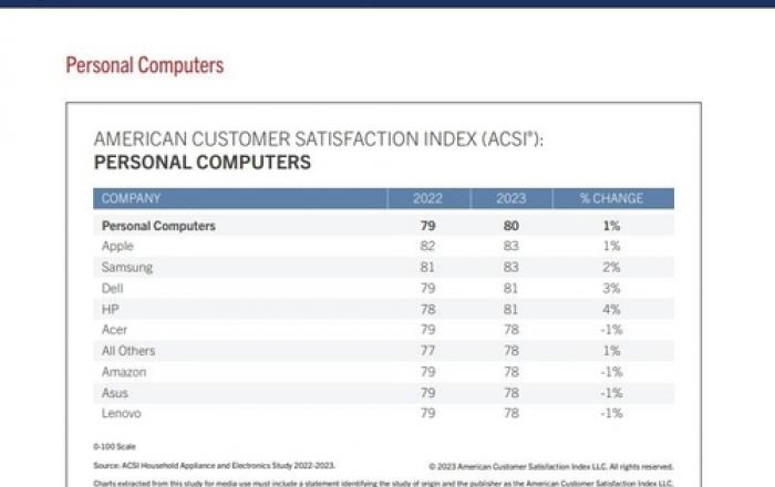 삼성전자가 미국 소비자들로부터 가장 만족도가 높은 PC(데스크탑·노트북·태블릿) 브랜드로 선정되며, 애플의 단독 1위를 저지했다. 미국 소비자만족지수협회(ACSI)가 20일 발표한 '2023년 소비자 만족도' 보고서에 따르면, 삼성전자는 PC부문에서 83점으로 가장