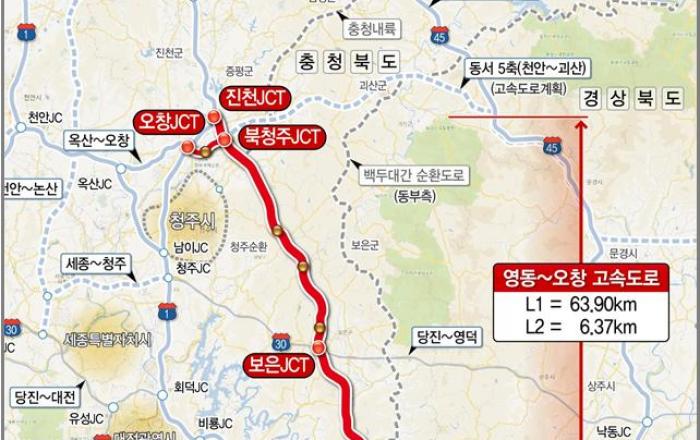 충북도는 국토교통부가 영동~오창 고속도로 건설(남북 6축) 사업에 대해 민간투자사업 방식으로 결정하고 지난 21일 한국개발연구원에 민자 적격성 조사를 의뢰했다고 밝혔다. 영동~오창 고속도로는 영동군 용산면 영동JCT에서 청주시 청원구 오창JCT까지 63.9㎞ 구간(