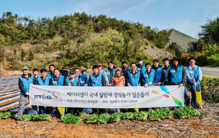 KT&G가 잎담배 농가의 안정적인 경작을 돕기 위해 경북 문경지역에서 지난 14일 잎담배 이식 봉사활동을 진행했다. KT&G 원료본부와 김천공장 소속 30여 명의 임직원들은 경북 문경시 농암면에 위치한 잎담배 농가를 방문해 약 10,000㎡(3,025평) 규모 농지