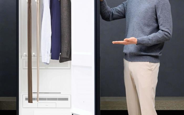 삼성전자 모델이 제품 외관 크기는 유지하면서도 한번에 관리 가능한 의류 수를 최대 9벌로 늘린 ‘비스포크 에어드레서’ 대용량 모델 신제품을 소개하고 있는 모습 삼성전자가 한번에 더 많은 의류를 관리할 수 있는 2023년형 ‘비스포크 에어드레서’ 신제품을 2일 출시한다
