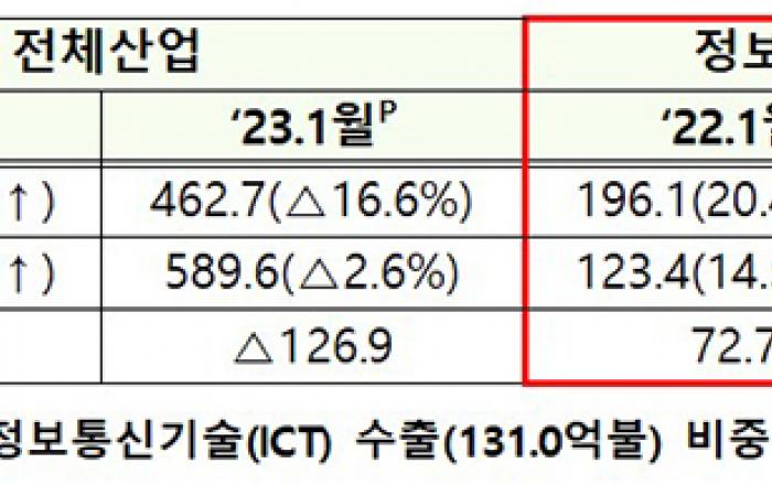 올해 1월 우리나라의 정보통신기술(ICT) 수출은 131억 달러, 수입 122억 1000달러를 기록한 가운데 무역수지 흑자는 8억 9000 달러를 거둔 것으로 나타났다. 과학기술정보통신부는 11일 ‘2023년 1월 ICT 수출 및 수입’ 현황을 발표, 수출은 7개