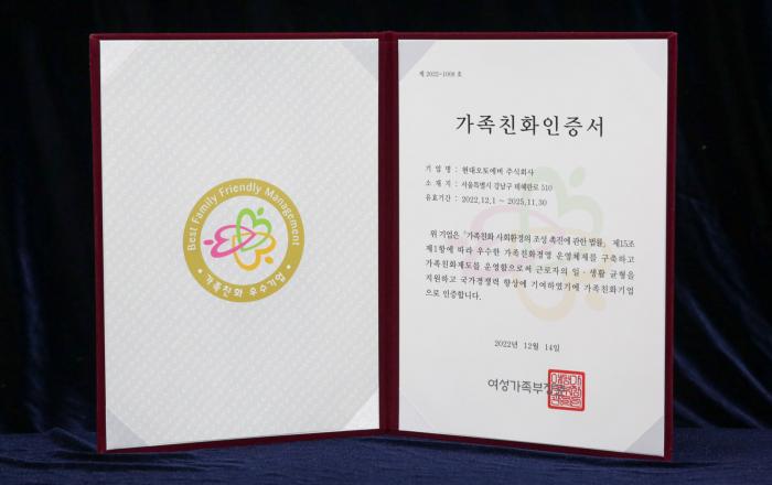 현대오토에버가 여성가족부에서 세 번째 ‘가족친화기업 인증’을 받았다고 27일 밝혔다.가족친화기업 인증 제도는 자녀 출산, 양육 지원, 유연근무제 등 가족친화적 직장 문화 조성을 위한 제도를 모범적으로 운영하는 우수 기업과 기관을 대상으로 인증을 부여하는 제도다.이번 인