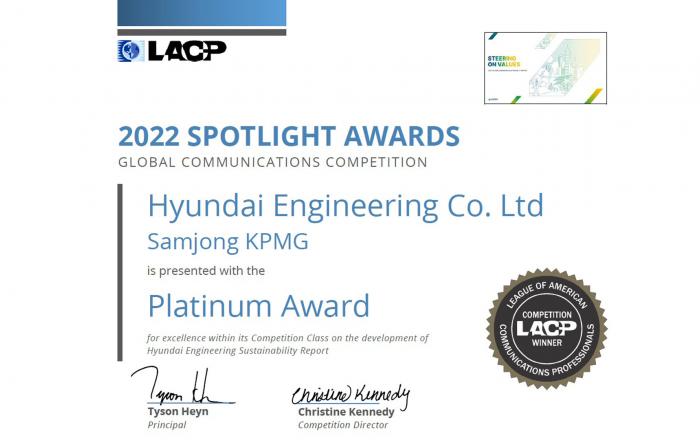 현대엔지니어링이 발간한 지속가능경영보고서가 미국 커뮤니케이션 연맹(LACP, League of American Communications Professionals)이 주관하는 ‘LACP 2022 스포트라이트 어워드(Spotlight Awards)’ 지속가능경영보고서 부
