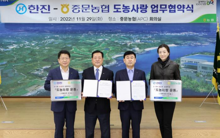한진이 농협중앙회가 주관하는 ‘도농社랑운동’에 참여하는 1호 기업으로서 제주 중문농협과 ‘도농社랑’ 업무협약을 체결했다.‘도농社랑운동’은 전국 지역농협과 기업간의 상생·협력을 통해 지역 특산품 공동마케팅, 농산물 구매, 농촌일손돕기 등 실질적인 도농교류 활동을 새로운