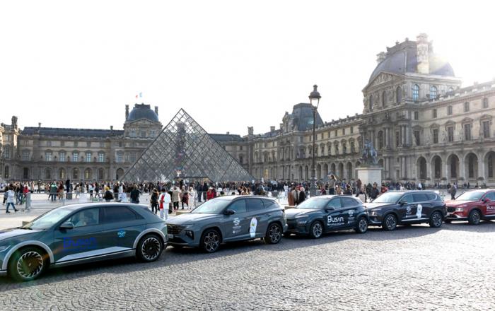 29일 프랑스 파리 팔레데콩그레에서 대한민국 대표단을 비롯한 경쟁국들이 2030 세계박람회 유치를 위해 치열한 경쟁 프레젠테이션을 펼친 가운데 회의장 주변에서는 부산세계박람회를 홍보하는 현대자동차 랩핑 차량이 거리를 순회하며 지원사격에 나섰다.현대자동차그룹은 지난 28