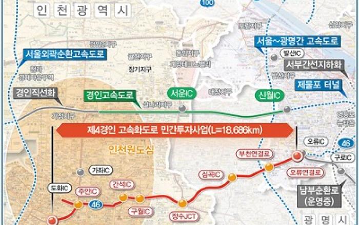인천시는 지난 7월에 접수된 민간제안사업인 제4경인고속화도로 건설사업을 10월 11일 한국개발연구원(KDI) 공공투자관리센터에 적격성조사를 의뢰했다고 밝혔다.제4경인고속화도로는 인천시 최초의 도시고속도로로서 인천 미추홀구 용현동에서 서울 구로구 오류동을 연결하는 것으로