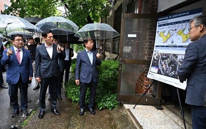 ▲ 오세훈 시장(왼쪽에서 두번째)과 박상우 국토교통부장관(왼쪽에서 세번째)이 구로구 온수동 재건축 사업 추진 현황 브리핑을 청취하고 있다.(서울시 제공)서울특별시와 국토교통부는 지난 12일 오전, 서울시 구로구 온수동에 위치한 대흥·성원·동진빌라 재건축 사업현