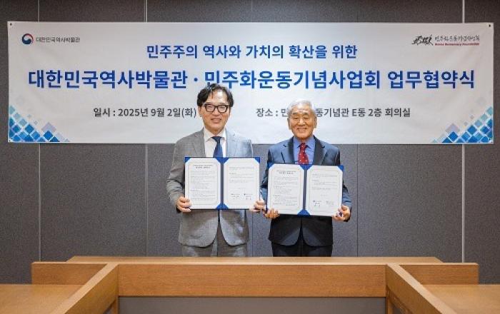 ▲ 업무 협약을 체결한 이재오 민주화운동기념사업회 이사장(오른쪽), 한수 대한민국역사박물관 관장(왼쪽)민주화운동기념사업회(이사장 이재오)와 대한민국역사박물관(관장 한수)은 9월 2일 오후 3시 서울 용산구 민주화운동기념관에서 민주주의 역사와 가치 확산을 위한
