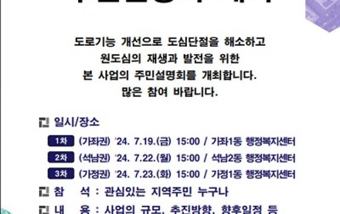 인천광역시는 오는 7월 19일부터 7월 23일까지 3개 권역, 3차에 걸쳐 서구 가좌1동(7월 19일), 석남2동(7월 22일), 가정1동(7월 23일) 행정복지센터에서 지역 주민과 함께 ‘인천대로 일반화 도로개량(2단계) 및 혼잡도로 개설공사’주민설명회를 개최한다.인