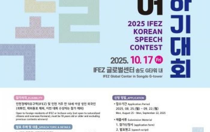인천시에 거주하는 외국인들을 대상으로 한 ‘한국어 말하기 대회’가 열린다.인천경제청은 오는 10월 17일 IFEZ 글로벌센터에서 ‘2025년 IFEZ 한국어 말하기 대회’를 개최한다고 밝혔다.이번 대회는 한국 사회와 문화에 대한 이해를 넓히고, 외국인들이 학습한 한국