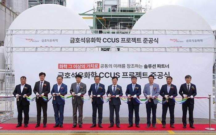 금호석유화학(대표이사 백종훈)은 CCUS(이산화탄소 포집∙활용∙저장) 설비 구축을 마치고 준공식을 가졌다고 밝혔다.이는 지난 2023년 12월 착공식 이후 약 19개월만이며, 금호석유화학은 이산화탄소 포집 설비를 본격적으로 가동하여 발전설비의 배기가스로부터 이산화탄소만