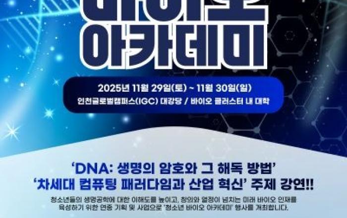인천경제청은 오는 29일부터 30일까지 양일간 대한민국의 바이오 분야 꿈나무들을 위한 ‘2025 대한민국 청소년 바이오 아카데미’를 개최한다고 밝혔다.인천글로벌캠퍼스 대강당에서 국내·외 석학의 강연을 시작으로 송도국제도시 내 바이오 기업 견학, 대학의 실험·실습 등 학