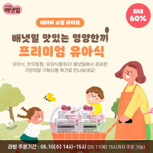 영유아 식품 전문기업 아이배냇의 신선배달 이유식 브랜드 '배냇밀'이 10일 오후 2시부터 3시까지 네이버 쇼핑라이브 채널에서 라이브 커머스를 진행한다.