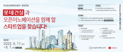 롯데건설이 개방형 혁신을 함께할 스타트업을 발굴하기 위해 부산창조경제혁신센터와 함께 5월 17일부터 6월 7일까지 'B.Startup 오픈이노베이션 챌린지 2023' 프로그램을 개최한다.