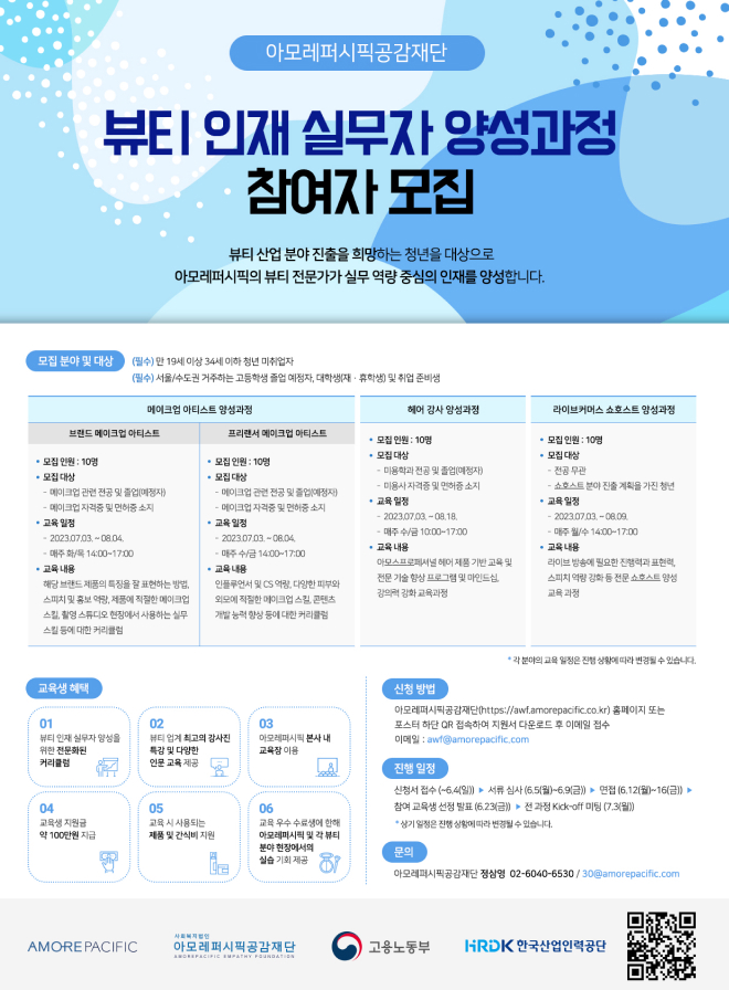 메이크업, 헤어, 라이브커머스 분야 전문가 양성 목적 / 아모레퍼시픽 실무진과 업계 전문가가 강사진으로 참여해 실무 역량 강화 중심 커리큘럼 제공 / 6월 4일까지 아모레퍼시픽공감재단 홈페이지에서 서류 접수
