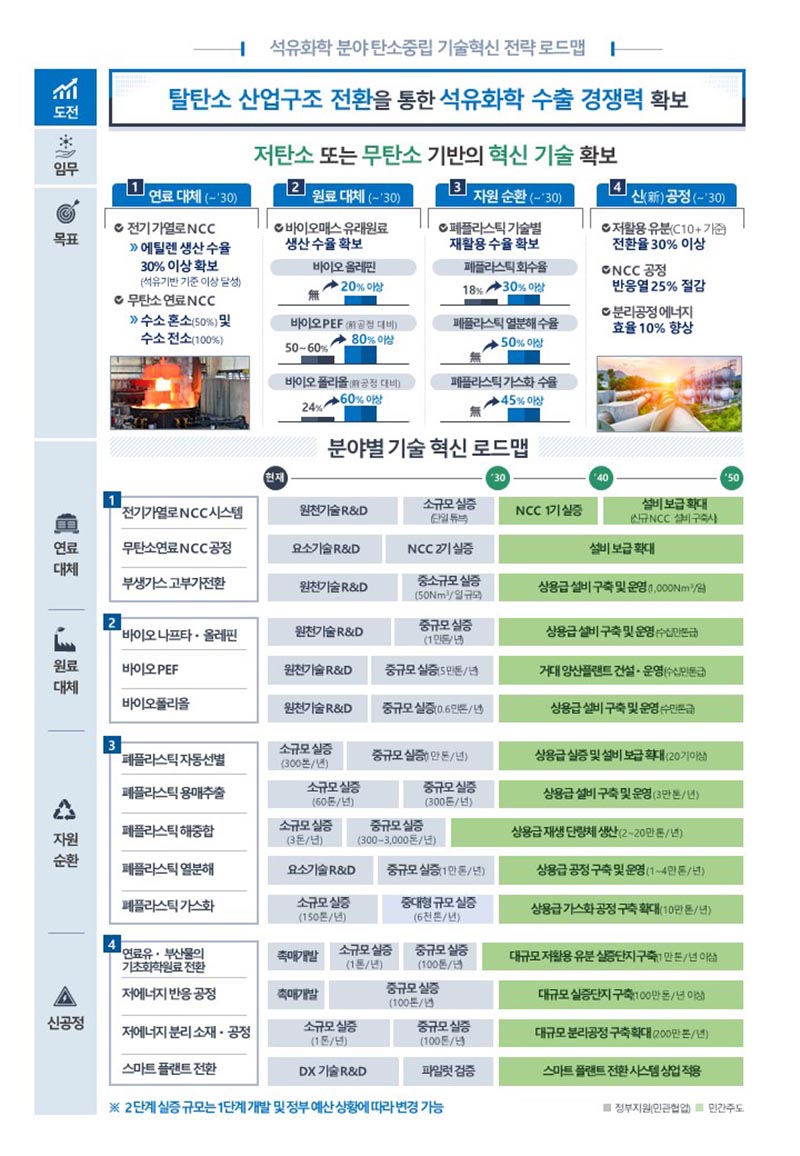 정부는 연료 대체, 원료대체, 자원순환, 신공정 등 석유화학 전 주기에 걸쳐 친환경 공정혁신기술이 2030년 전후를 기점으로 상용기술로 안착하는 것을 목표로 기술 개발 전략을 수립했다.