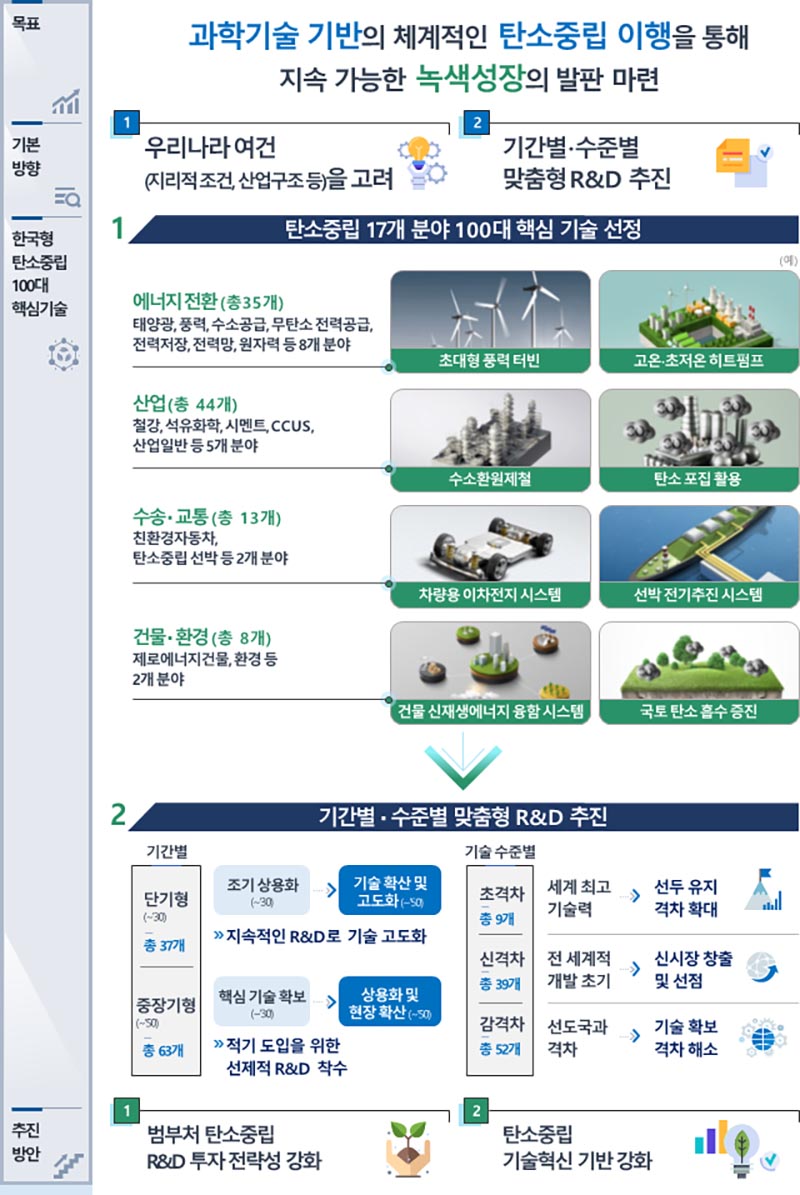 한국형 탄소중립 100대 핵심기술은 범부처 차원의 탄소중립 기술개발 방향성을 제시하기 위한 것으로 지리적 여건, 고탄소 제조업 중심의 국내 산업 구조, 국내외 기술 수준 등을 종합적으로 고려해 한국 탄소중립 실현을 위해 반드시 필요한 기술로 선별됐다.