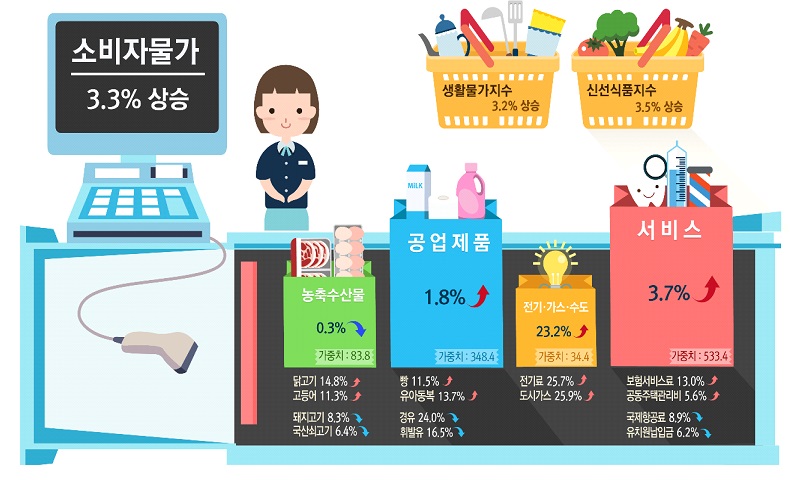 지난달 소비자물가가 전년 대비 3.3% 오르며 19개월만에 가장 낮은 물가 상승률을 보였다.